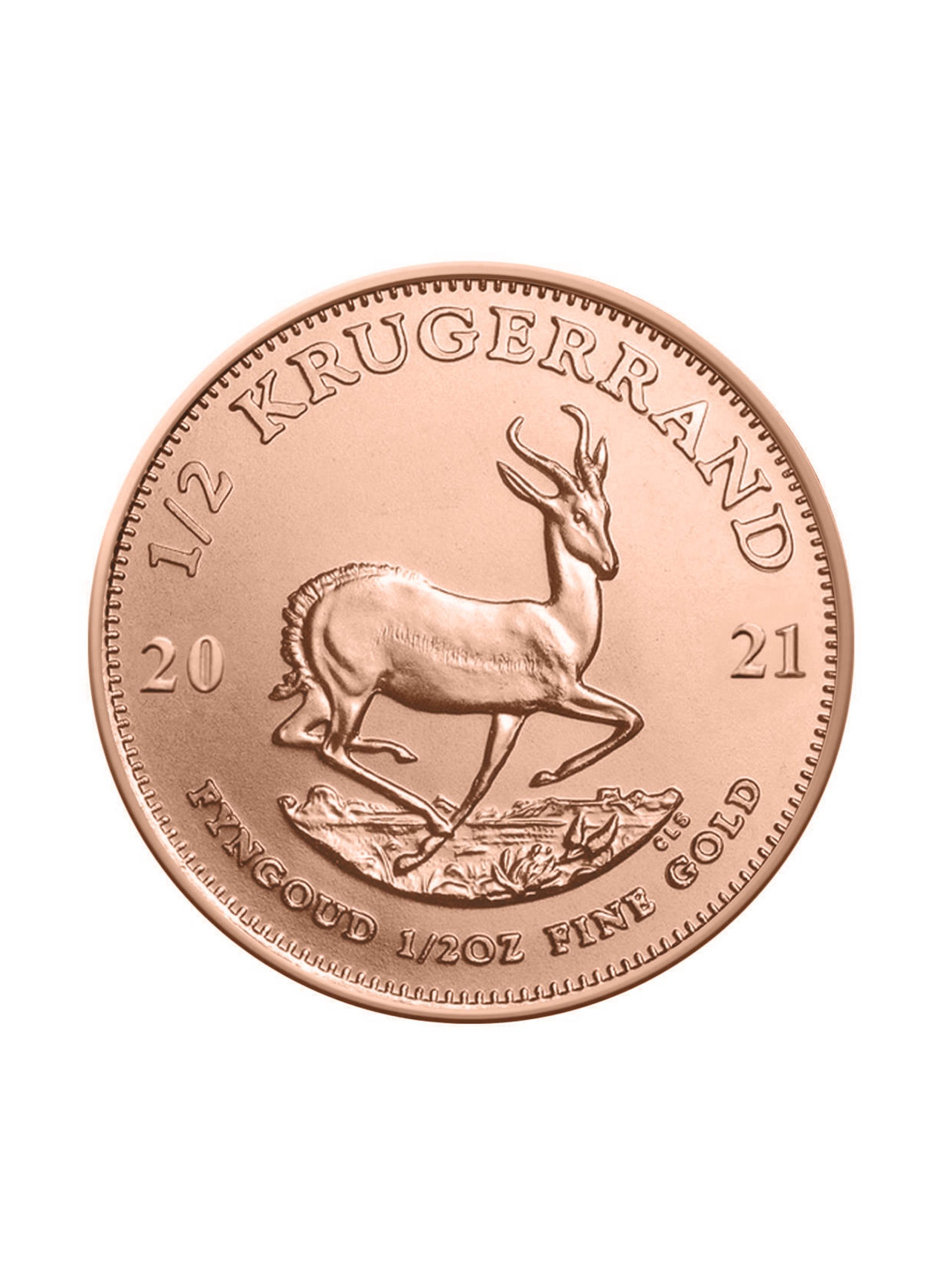 Im Gegensatz zur 1oz Krügerrand wird die 1/2oz Krügerrand Goldmünze erst seit dem Jahr 1980 von der South African Mint geprägt. Die 1/2oz Krügerrand hat ein Bruttogewicht von 16,97g und einen Feingoldgehalt von 15,552g Au. Der Durchmesser beträgt 27,0mm und die Dicke 2,2mm. Ihre charakteristische rote Färbung verdankt sie seiner Zusammensetzung aus 916,67 Anteilen Gold und 83,33 Anteilen Kupfer, was ihr zusätzlich eine höhere Kratzfestigkeit verleiht. Auf der Vorderseite ist der südafrikanische Präsident Paul Kruger (1882-1902) abgebildet. Auf der Rückseite der Springbock als Wahrzeichen der Republik Südafrika.