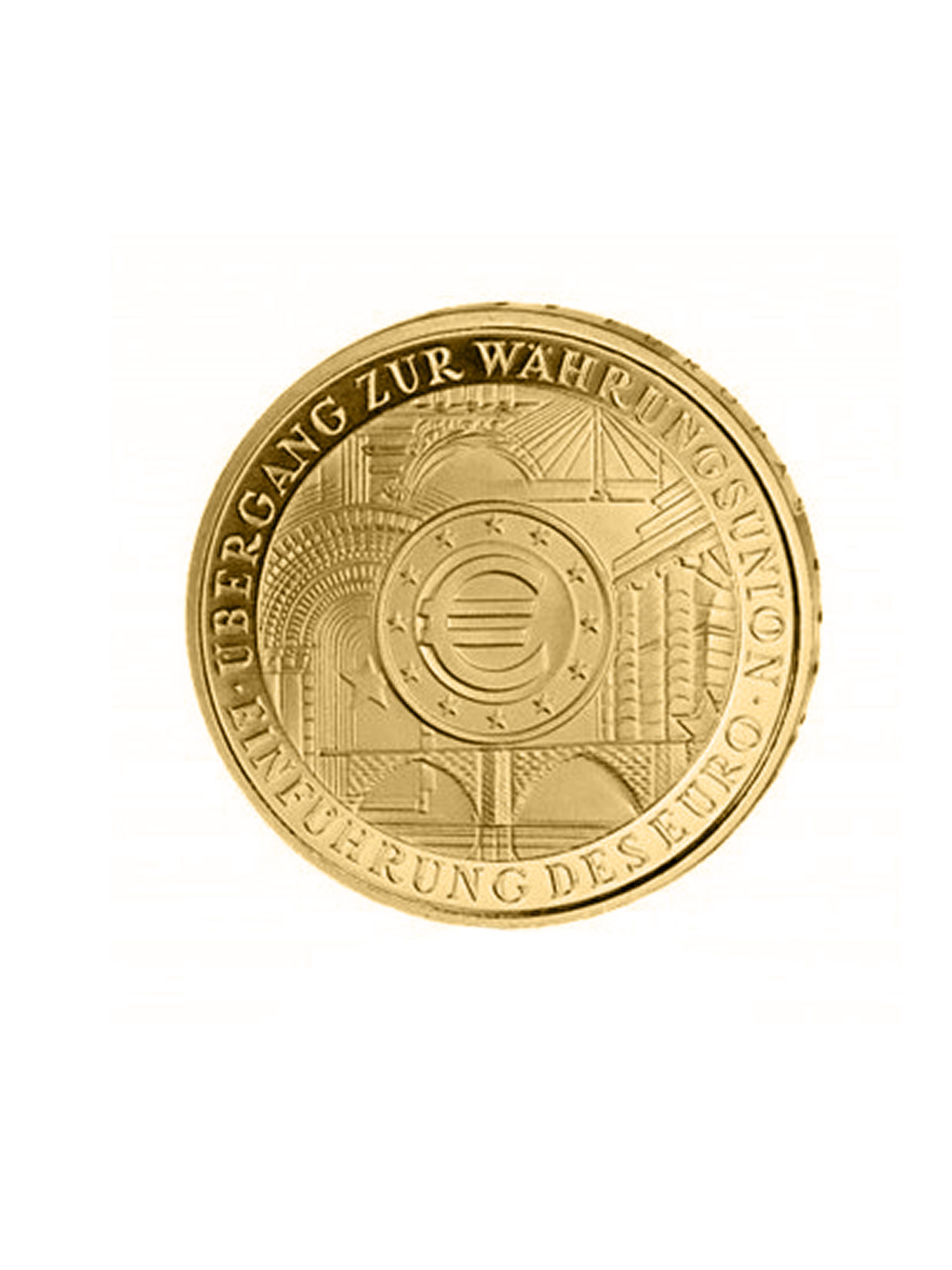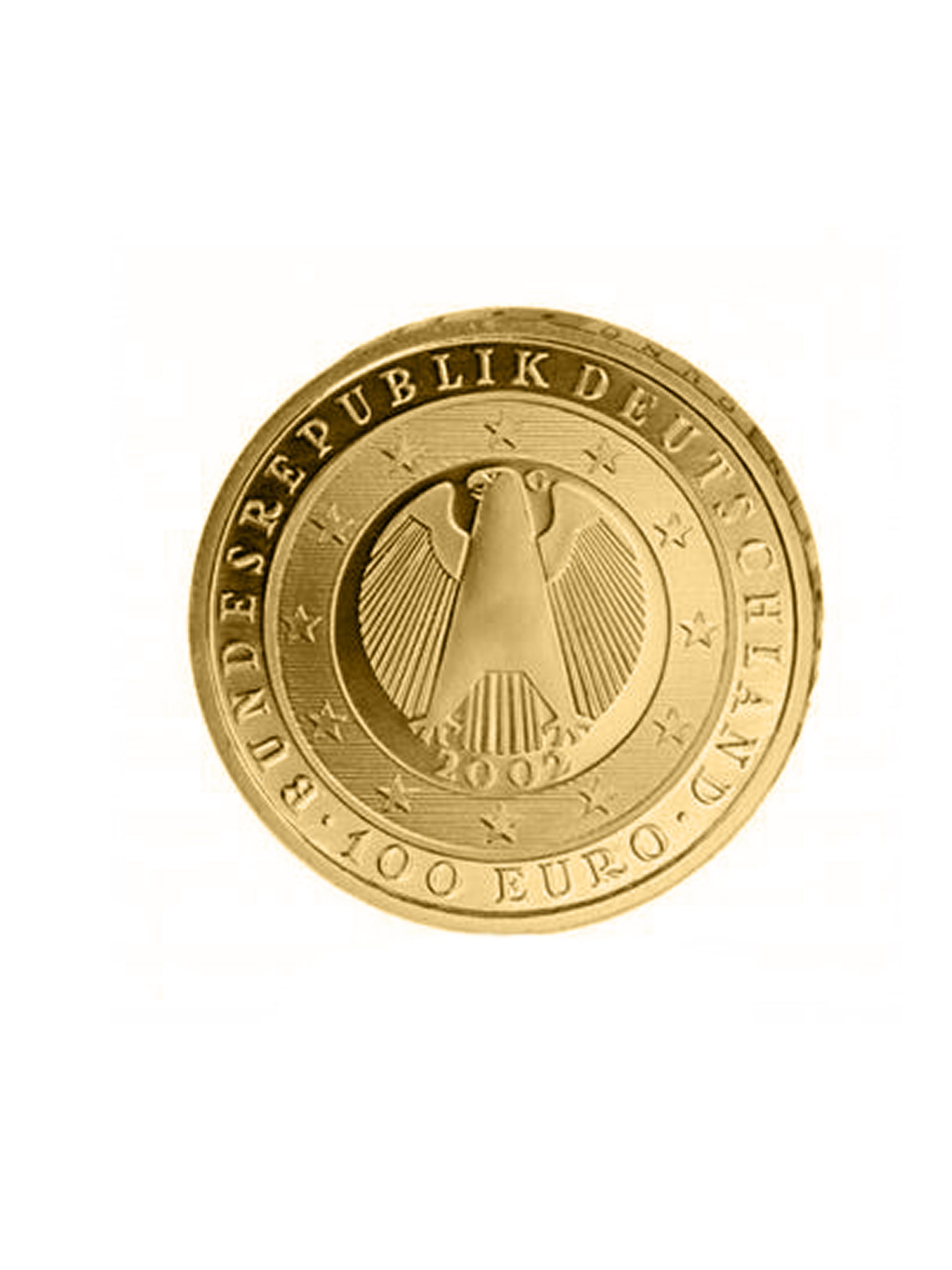 Die 100 Euro Goldmünze “Übergang zur Währungsunion – Einführung des Euro“ wird einzeln gekapselt in der Original Münzschatulle und mit Echtheitszertifikat geliefert. Aufgrund der streng limitierten Prägeauflage von weltweit 500.000 Stück eignet sich diese Münze ideal als Wertanlage. Der Entwurf der Bildseite dieser 100 Euro Münze stammt von dem Neuberger Künstler Anton Zvone Jesovsek. Die Umschrift der Gedenkmünze lautet “Übergang zur Währungsunion – Einführung des Euro”. Geprägt werden die Gold Euro Münzen, verteilt auf alle fünf Münzprägeanstalten der Bundesrepublik Deutschland (A, D, F, G und J) mit jährlich wechselnden Motiven und mit einer Feinheit von 999,9/1000. Bedingt durch die für Sammlermünzen niedrige Prägeauflage verspricht diese einzigartige Goldmünze ein hohes Wertsteigerungspotential. Der Ausgabepreis betrug damals 193 Euro. Jahrgang 2002 “Einführung des Euro” ist auch als 200-Euro-Münze mit einem Gewicht von 31,1oz erhältlich.