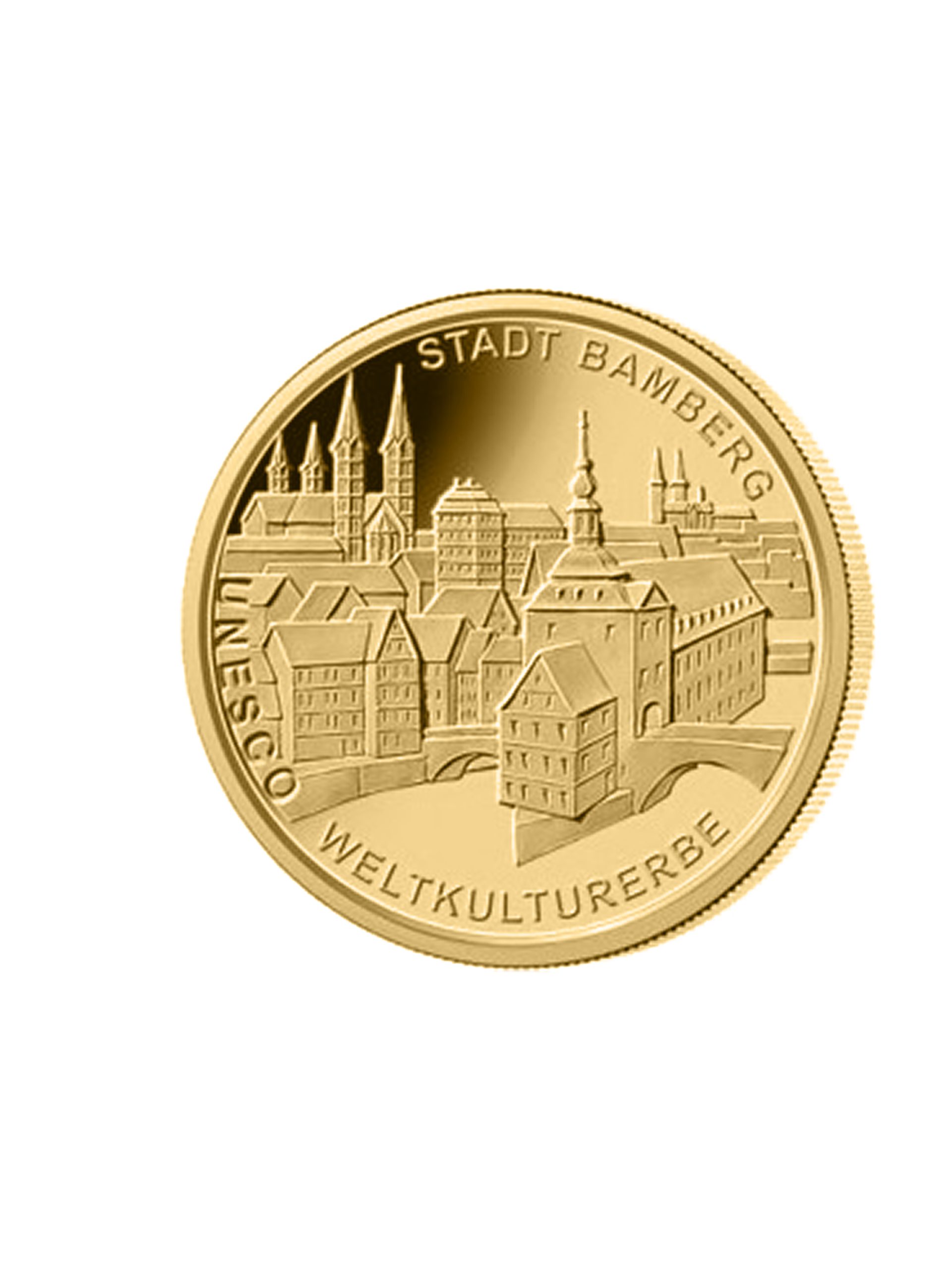 Thema der 2004er “100 Euro Goldmünze” ist die “UNESCO Weltkulturerbe Stadt Bamberg”. Die Kaiser- und Bischofsstadt wurde wie Rom auf sieben Hügeln erbaut. Überragt vom Kaiserdom stellt sie ein denkmalgeschütztes Ensemble-Kunstwerk zwischen Mittelalter und bürgerlichem Barock dar. Die unverändert erhaltene Altstadt umfasst die drei historischen Stadtzentren Berg-, Insel- und Gärtnerstadt. Überragt vom Dom stellt die Stadt ein denkmalgeschütztes Ensemble zwischen mittelalterlicher und barocker Baukunst dar. Im Bamberger Kaiserdom sind u.a. das heiliggesprochene Kaiserpaar Heinrich II. und Kunigunde und Papst Clemens II. (der einzige Papst der nördlich der Alpen begraben wurde) beerdigt. Der Stuttgarter Design-Professor Ulrich Böhme schuf Bild und Wertseite der Münze. Dargestellt ist die Stadtansicht Bambergs mit Dom und Michaelsberg und das alte Rathaus als Verbindung zur Inselstadt. Auf der Wertseite, die jährlich wechselnde Interpretation des deutschen Wappenadlers mit den 12 Europa-Sternen.