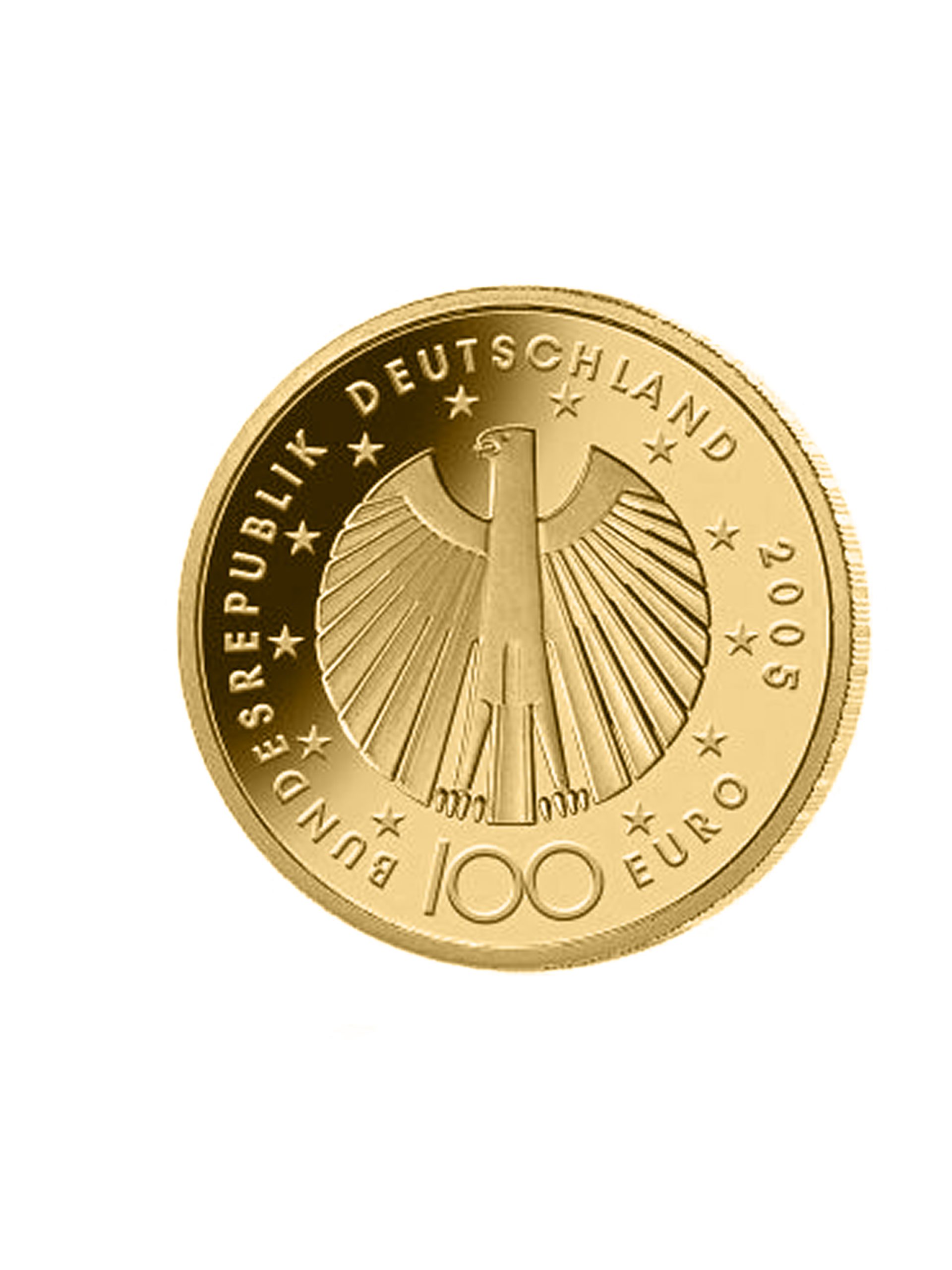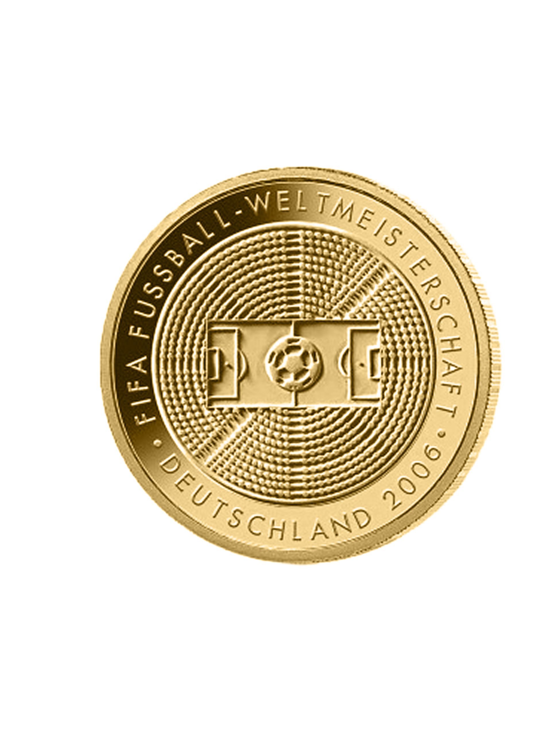 Die Bildseite der “100 Euro Goldmünze 2005” zeigt ein stilisiertes vollbesetztes Fußballstadion von oben und das Spielfeld mit den beiden Toren. Im Mittelpunkt der Spielball. Die deutsche Nationalmannschaft blieb zwar ohne den erhofften Weltmeistertitel, so war doch das “Sommermärchen” Fußball WM in Deutschland ein voller Erfolg. Die Wertseite zeigt einen Adler, den Schriftzug „Bundesrepublik Deutschland“, zwölf Europasterne, die Wertziffer „100“ mit der Euro-Bezeichnung sowie die Jahreszahl „2005“ und das jeweilige Münzzeichen der fünf Staatlichen Münzstätten.