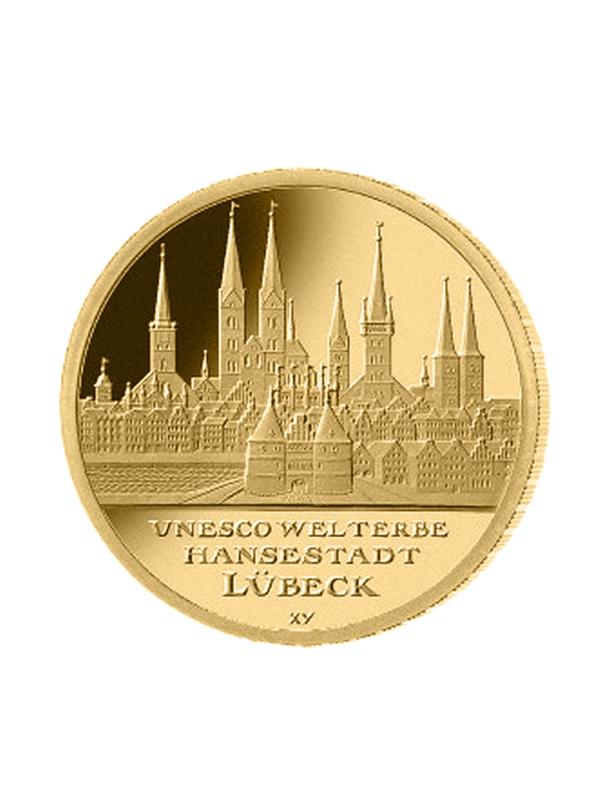 Die deutsche “100€ Goldmünze des Jahres 2007 ist Lübeck” gewidmet. Seit 1987 ist Lübeck mit seinen erhaltenen Bereichen der Altstadt mit über tausend Kulturdenkmalen, Teil des Unesco-Welterbes. Auf der Motivseite der Münze sehen Sie die sieben Türme der fünf gotischen Hauptkirchen sowie im Vordergrund das Holstentor, als eines der Wahrzeichen der Stadt. Nicht abgebildet, aber wohl ebenso bekannt – Das Lübecker Marzipan.