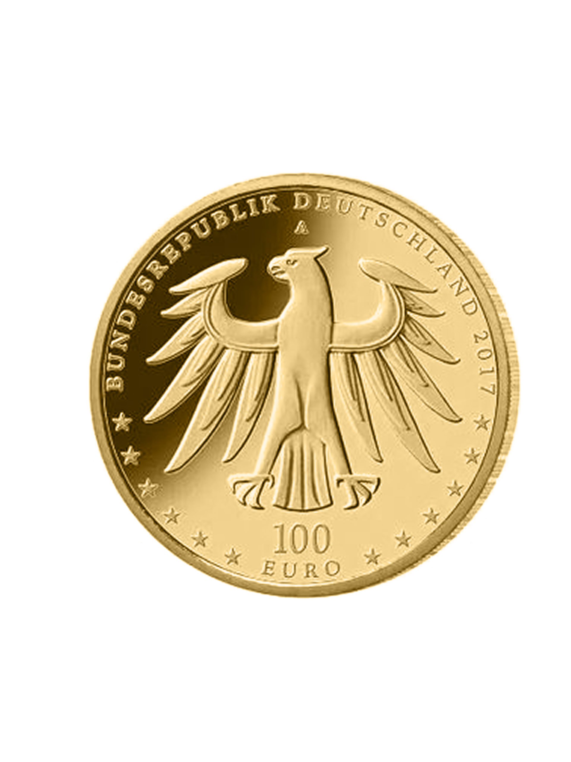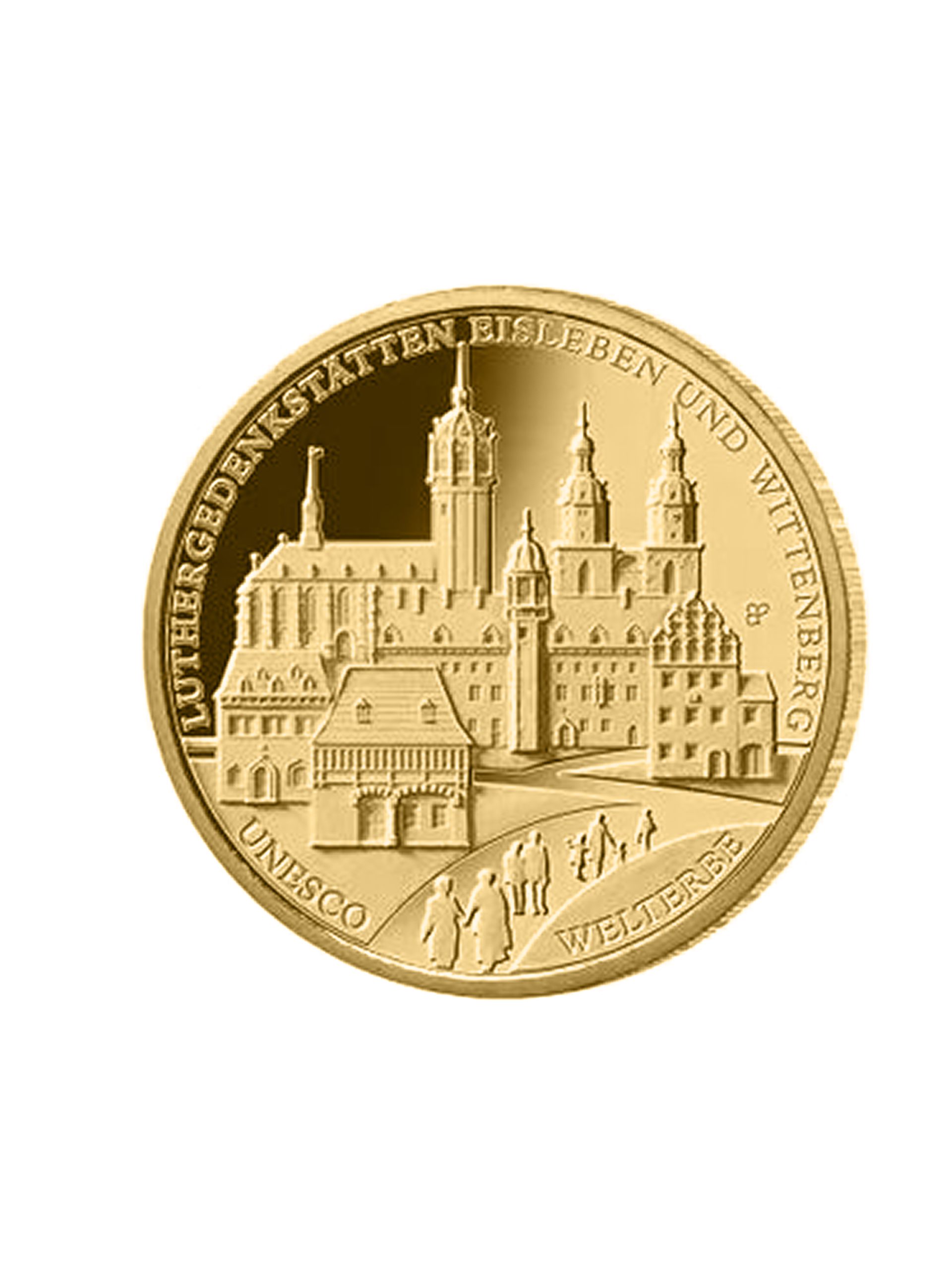 Mit der 100€ Goldmünze 2017 würdigt man die “Luthergedenkstätten Eisleben und Wittenberg”. Die Schauplätze der Reformation wurden im Jahr 1996 in die Welterbeliste der UNESCO aufgenommen. Die Bildseite zeigt die sechs UNESCO-Welterbestätten in gestaffelter Platzierung mit den Eisleber Stätten im Vordergrund und dem Lutherhaus als Lebensmittelpunkt des Reformators im Zentrum. Der Entwurf stammt von dem Künstler Bastian Prillwitz, Berlin.