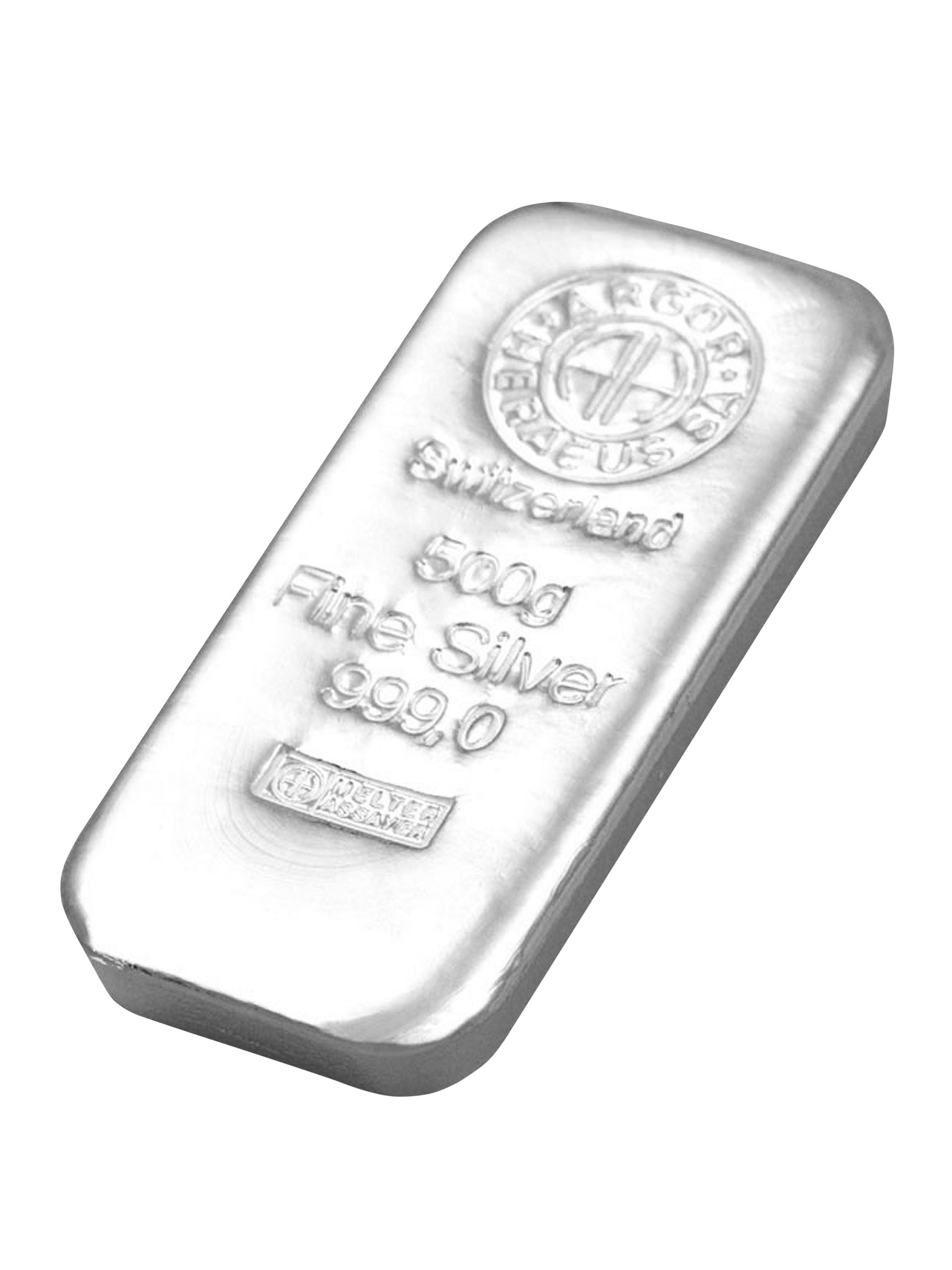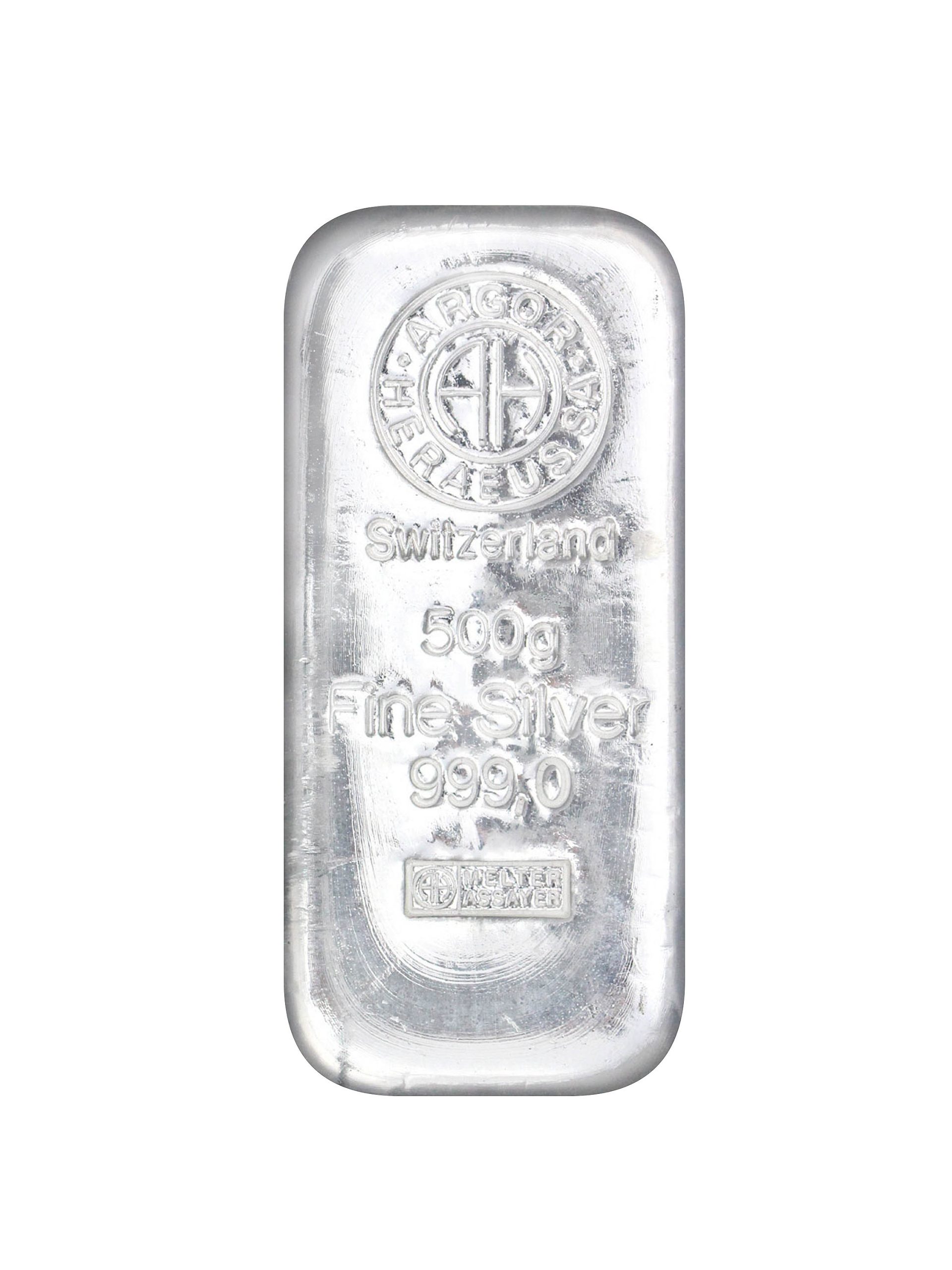 Abgebildet ist ein 500g Silberbarren mit einer Feinheit von 999/1000 des Schweizer Herstellers Argor-Heraeus.